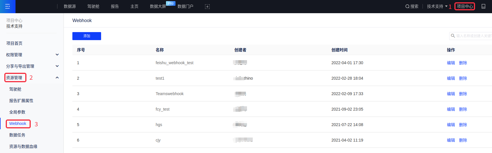 在[项目中心-资源管理-Webhook],如果您具备管理员权限,则可以管理该项目下所有Webhook,增加、删除和编辑对应的Webhook。