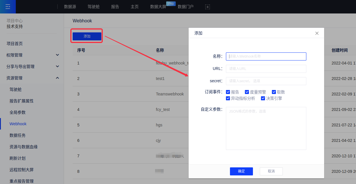 - 订阅事件:报告、度量预警、取数、异动指标分析、决策引擎,不选择报告时将无法把报告发到对应的Webhook