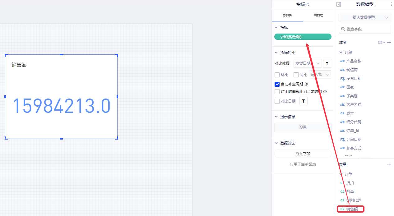 (2)将关心的字段(如“销售额”)拖入指标区域,图表区域会显示指标数值,指标卡的左上角会显示指标的标题;