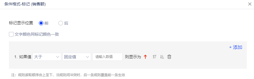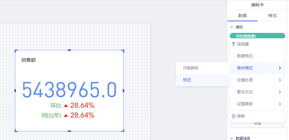 (6)指标卡支持条件格式,下拉列表选择[条件格式],呼出设置弹窗中可设置条件格式,同表格的条件格式设置,不再赘述。