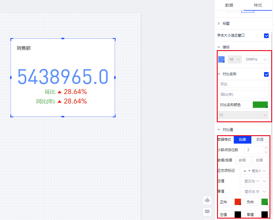 (5)您可在样式面板修改“同比”、“环比”的文案内容及颜色等样式,并支持设置空置和零值的显示内容和样式;