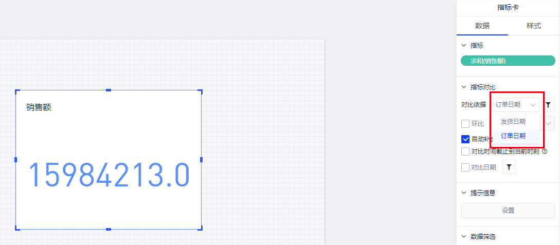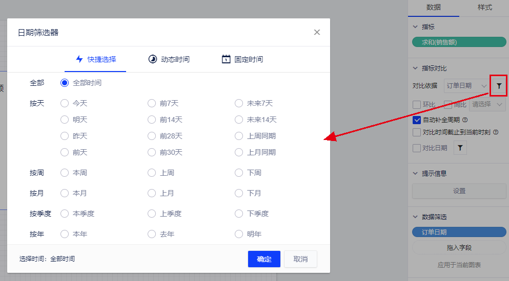 (3)如果需要同时显示指标的变化趋势(比如同比、环比),则需选择一个时间维度并设置时间范围,这里选择的是“订单日期”;