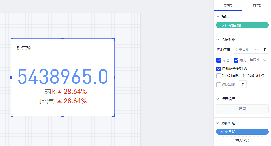 指标卡可用于直观展示核心指标值(即度量值)及其变化趋势(如同比、环比)。本文将举例介绍指标卡的画法。