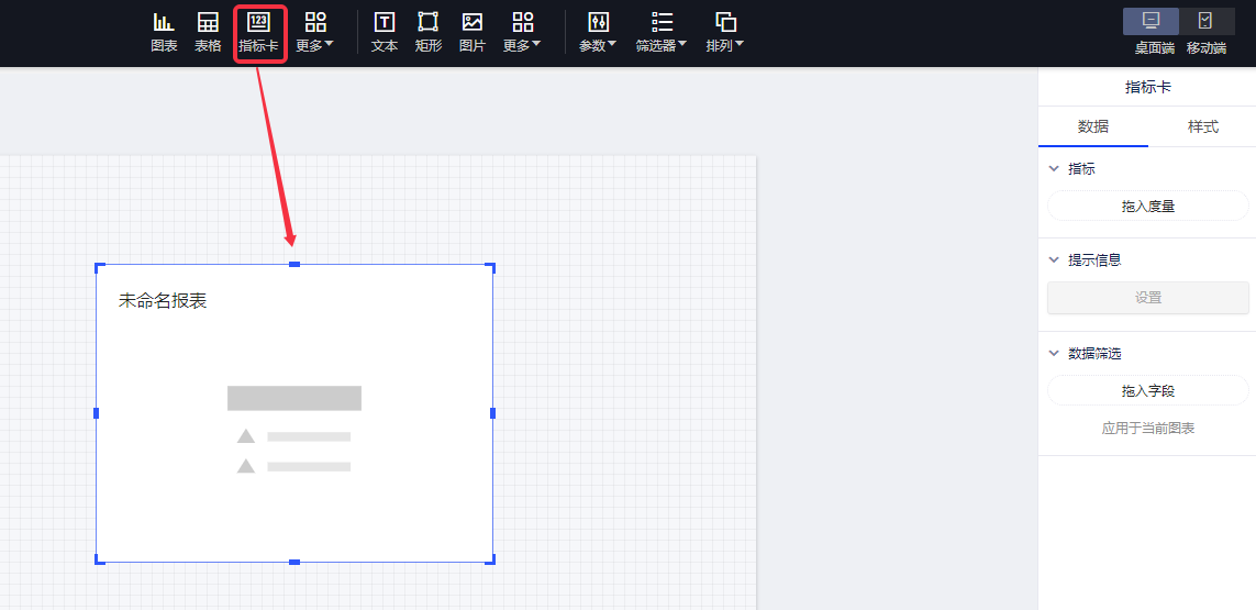 (1)选择“指标卡”控件,在画布上画出“指标卡”;