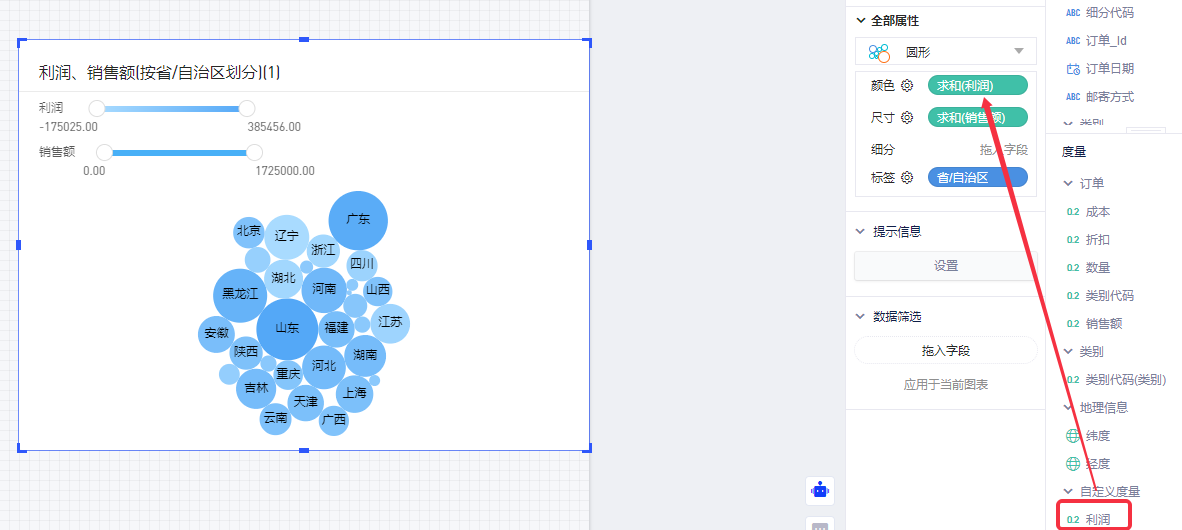 (3)如果需要用颜色深浅来表示利润的多少,可以将“利润”拖入属性面板的颜色项,如下图所示: