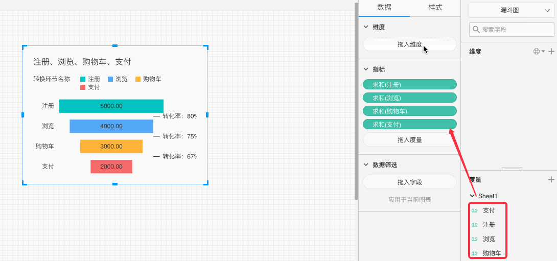 (2)将多个度量拖入指标区域,即完成漏斗图的绘制;