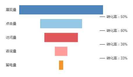 漏斗图适用于业务流程比较规范、周期长、环节多的流程分析,如图所示,左侧是每个环节对应的指标值,右侧显示的是每个环节的转化率,不同颜色表示不同的环节。通过漏斗各环节业务数据的比较,能够直观地发现和说明问题所在。