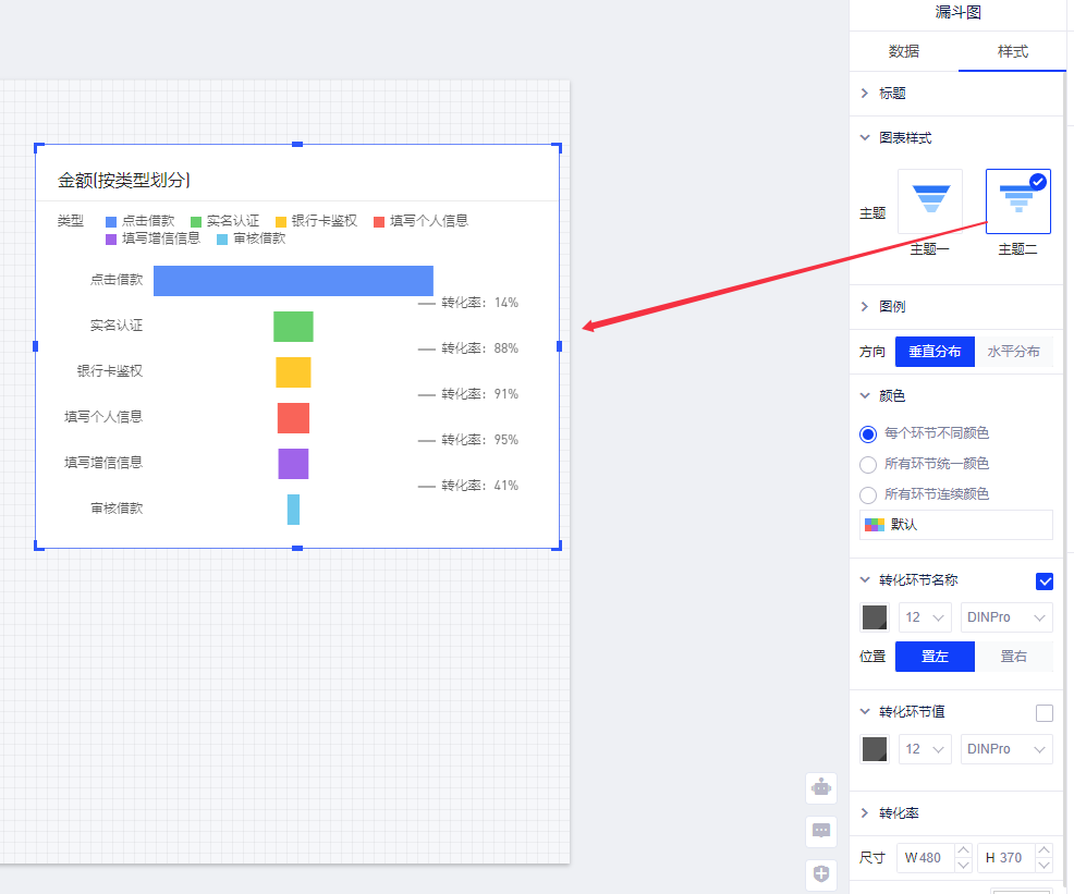 (3)在样式面板,您可以自由配置图表样式、漏斗方向、转化环节名称等。
