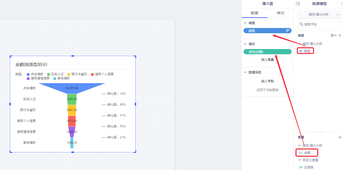(2)将“环节”拖入维度区域,将“数量”拖入指标区域,即完成漏斗图的绘制;