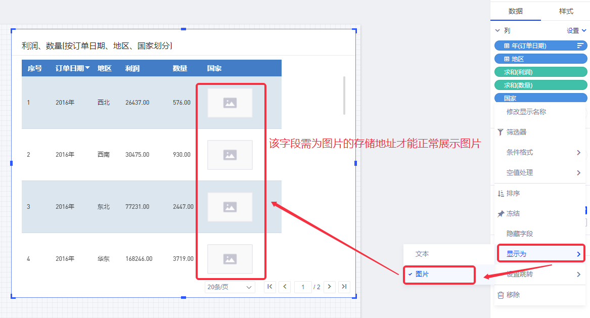 (9)表格支持把字段以图片样式展示,鼠标Hover在字段上,点击下拉菜单(也可右键呼出)选择“显示为”-“图片”。当选择显示为图片时,示意图如下: