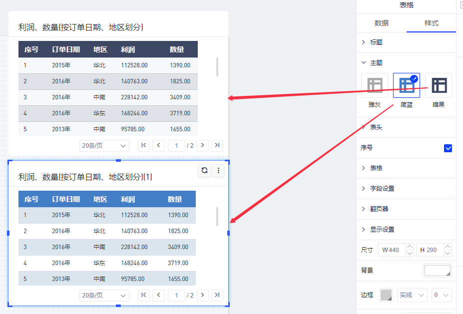 表格是由一行或多行单元格组成,用于显示数字和其他项以便快速引用和分析,您通过简单地配置即可展示出对应的明细数据。同时表格还支持样式配置、条件格式、排序和聚合等操作。