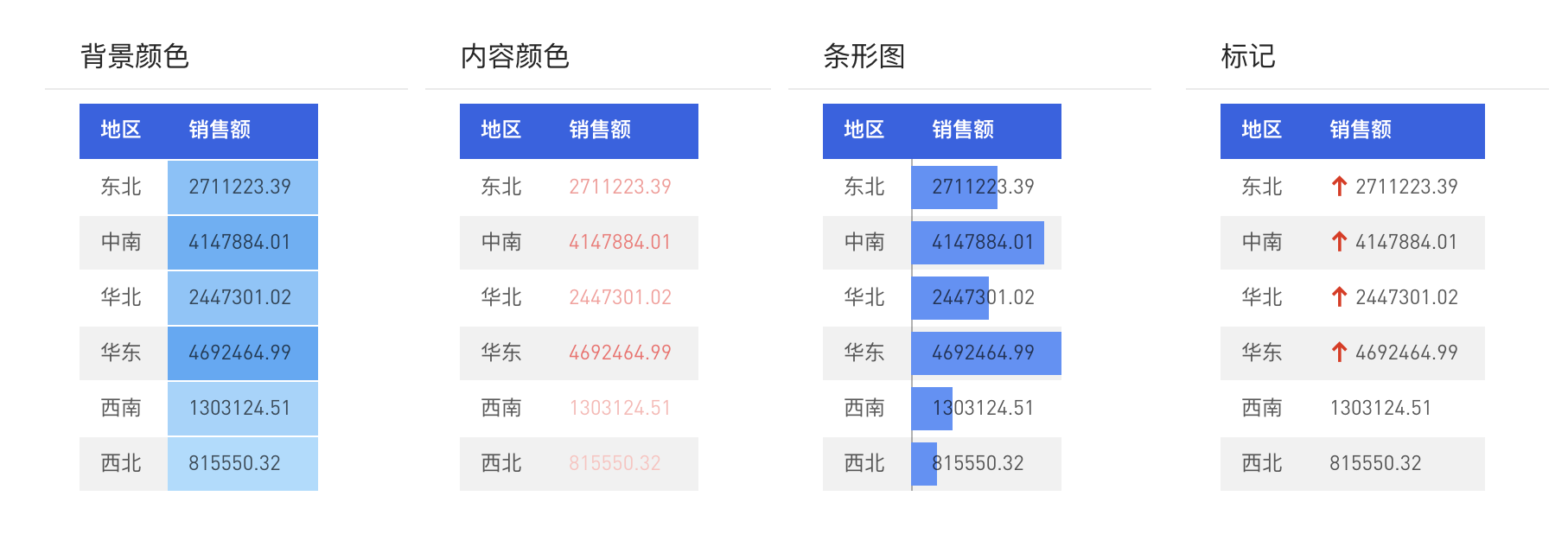 使用条件格式,可以用颜色或图形对单元格进行标记,让重要或异常的数据更加醒目。表格支持4种条件格式的设置:背景颜色、内容颜色、条形图、标记。4种条件格式的效果如图所示,可以叠加: