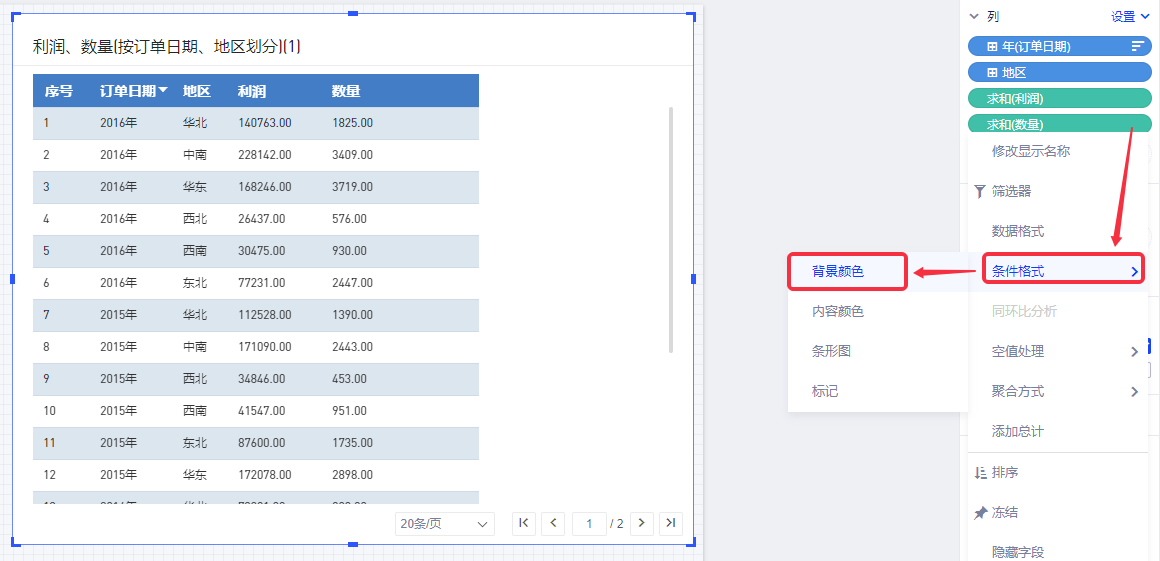 - 依据字段:当前字段可以依据其他字段的值来显示条件格式。例如地区字段可以依据销售额大小来显示条件格式,将销售额大于10000的地区字段标红。
