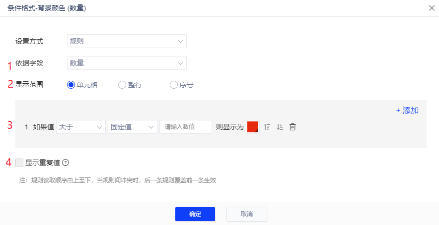 - 显示范围:可以选择单元格、整行或序号。即设置条件格式应用的范围,是仅单元格,还是单元格所在的整行数据,或者单元格所在的序号字段(勾选显示序号后序号才会生效)。