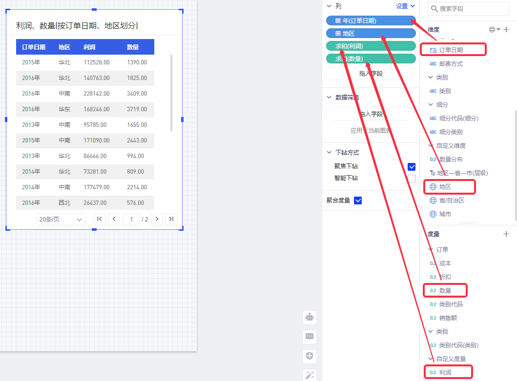 通常用于展示数据的详细信息或多个具有直接关系数值的场景下。以默认数据模型为例,展示各个年度、各地区的销售额、利润、数量,将涉及到4个字段: 维度“订单日期”、“地区”,度量“利润”、“数量”。