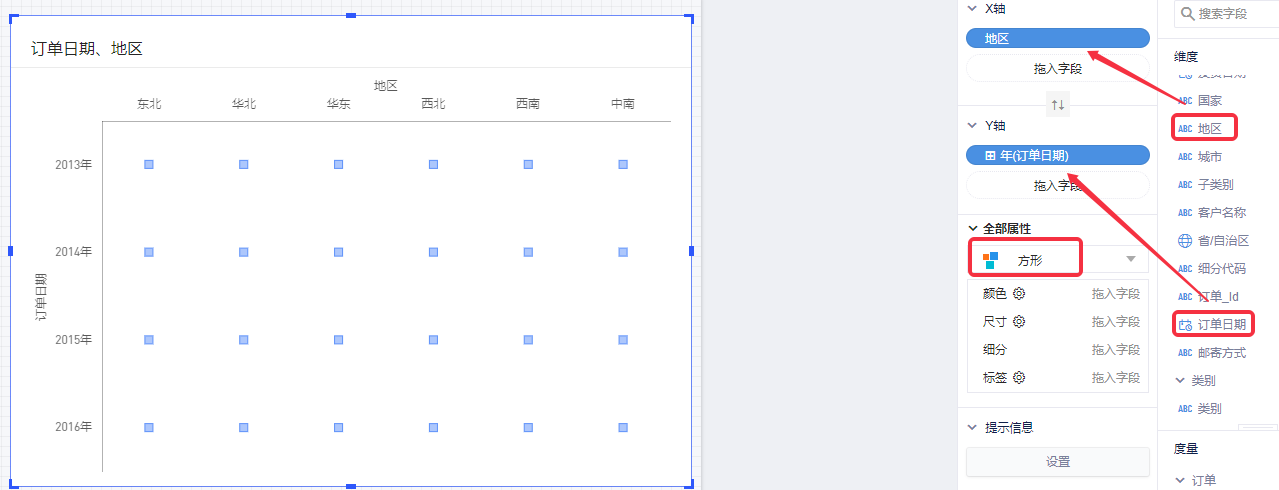 (2)将“订单日期”字段拖入Y轴,“地区”字段拖入X轴,在属性面板中图表类型选择“方形”;
