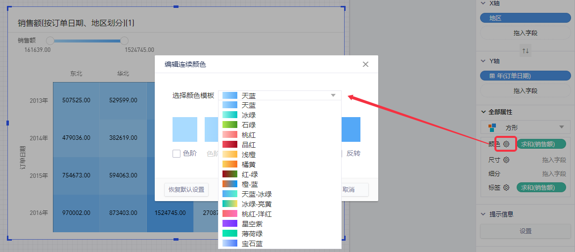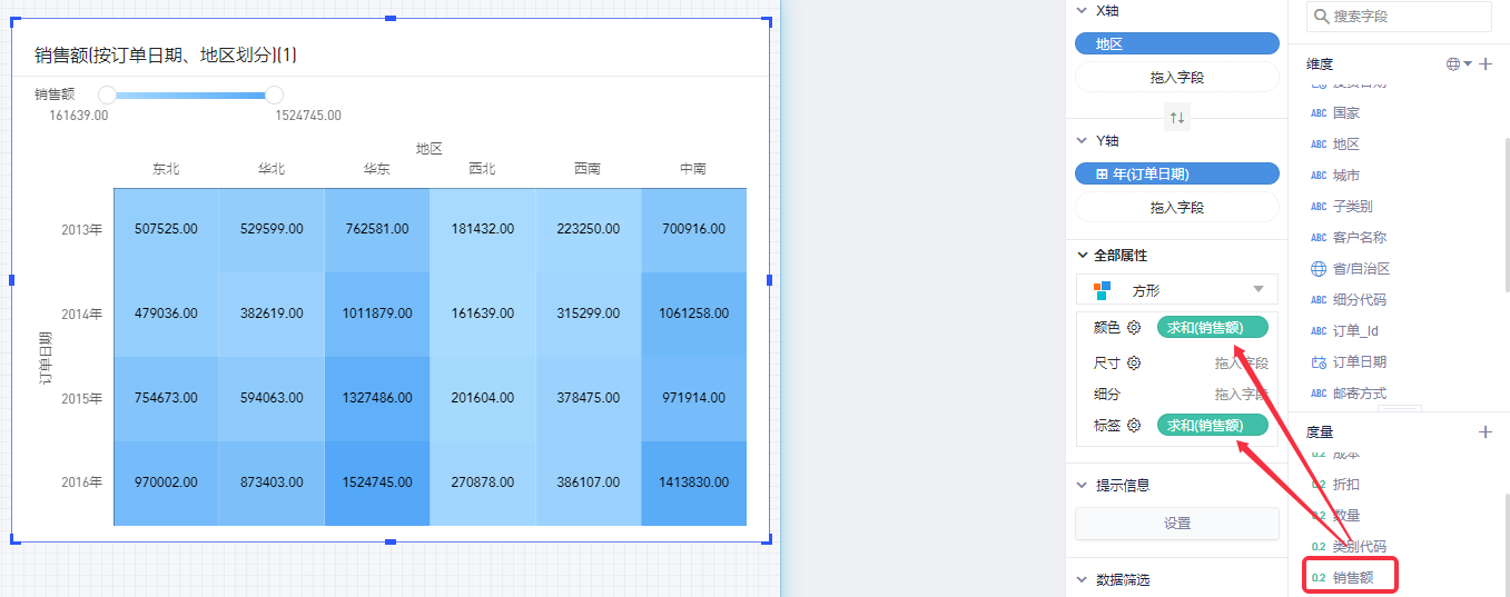 以默认数据模型为例,查看各个年度、各地区的销售额情况,将涉及到3个字段:维度“订单日期”、“地区”,度量“销售额”。