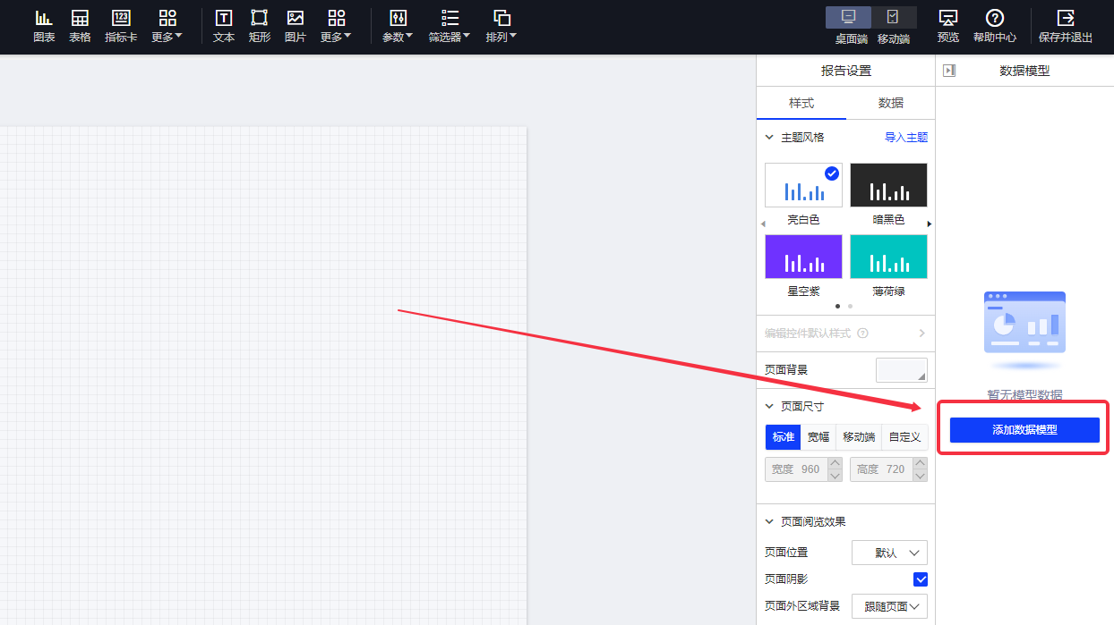 在右侧字段列表区,点击[添加数据模型],选择您在数据源模块已建好的数据模型(如果您是初次体验或测试产品,也可在列表中选择系统提供的”默认数据模型”)。