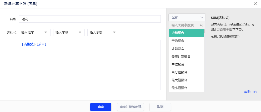 借助计算字段,您便可以用本产品提供的函数表达需要的计算。例如,毛利=销售额–成本,那么当我们想看不同地区的成本就需要借助计算字段。详情可见[计算字段]。