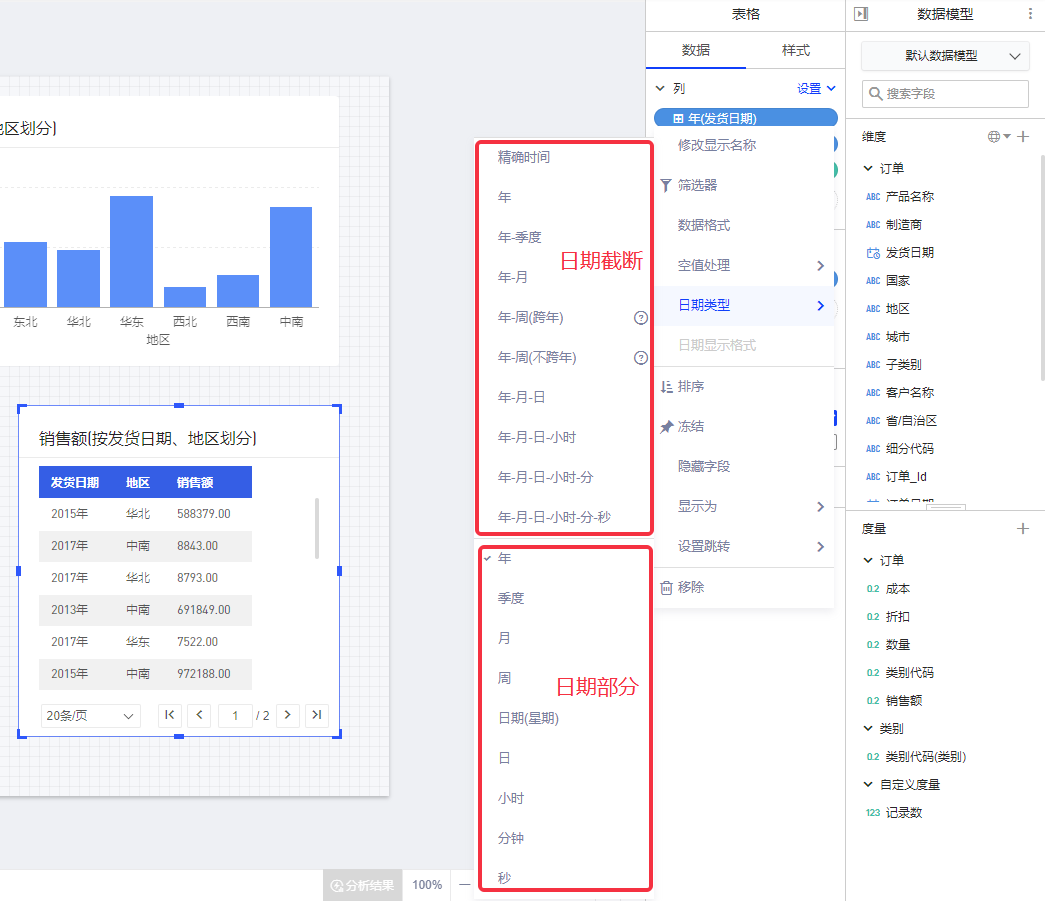 如果选择了日期中月的部分,那么所有数据都会按它所在的月根据聚合函数聚合。其他的日期时间部分的函数同理。