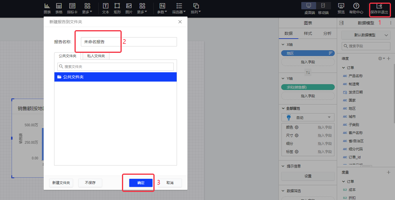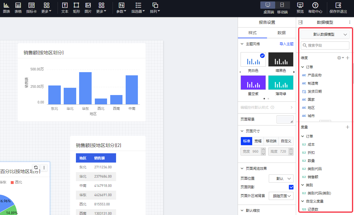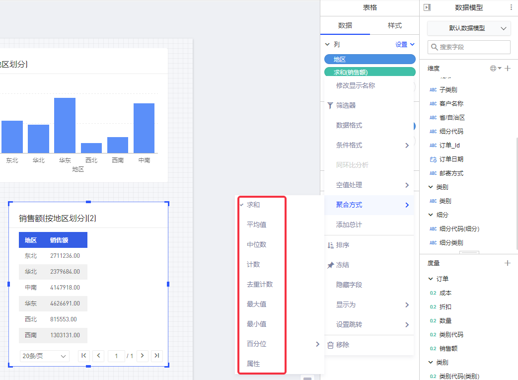 例如:查看每个地区的销售额,则可将”地区”配为维度,将”销售总额”(即销售额之和)配为度量。