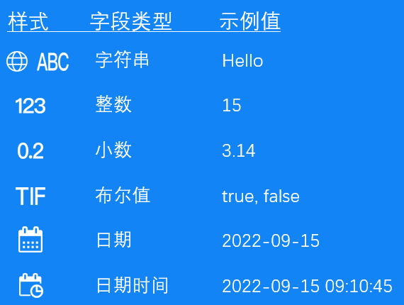 本产品提供了6种字段类型:字符串、整数、小数、布尔值、日期和日期时间。