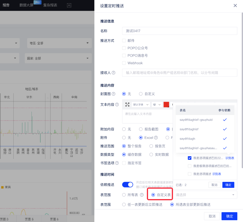 - 推送范围可选择推送整个报告、报告内某一报告页或某个组件