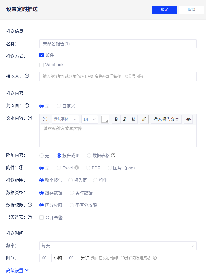 (2)您可设置推送的名称、推送方式(邮件或者Webhook)、接收人、推送内容及推送时间;