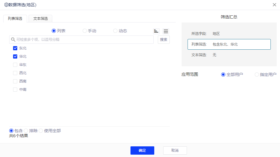 (1)在列表选项中,如果勾选东北、华北并设置包含,则整份报告只包含这两个地区的数据;