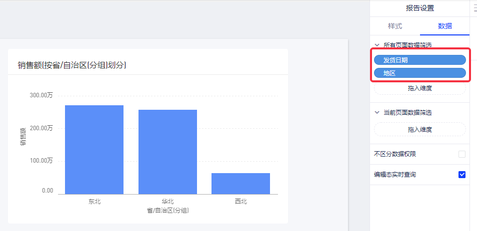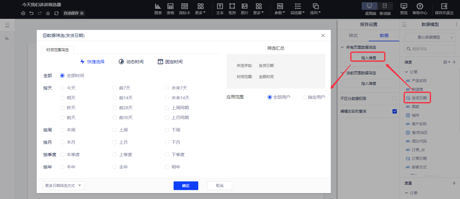 第三步:将时间维度字段拖入【所有页面数据筛选】的筛选器;比如将时间类型字段“发货日期”拖入筛选器,将触发时间筛选。