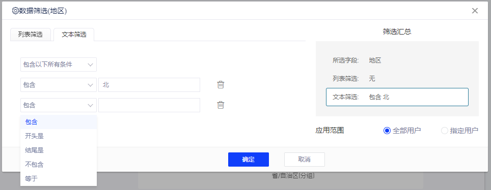 (2)在文本筛选中,如果输入包含“北”,则当前页面的图表只包含“东北”、“华北”、“西北”的数据,以及未来新增含有“北”的成员数据;