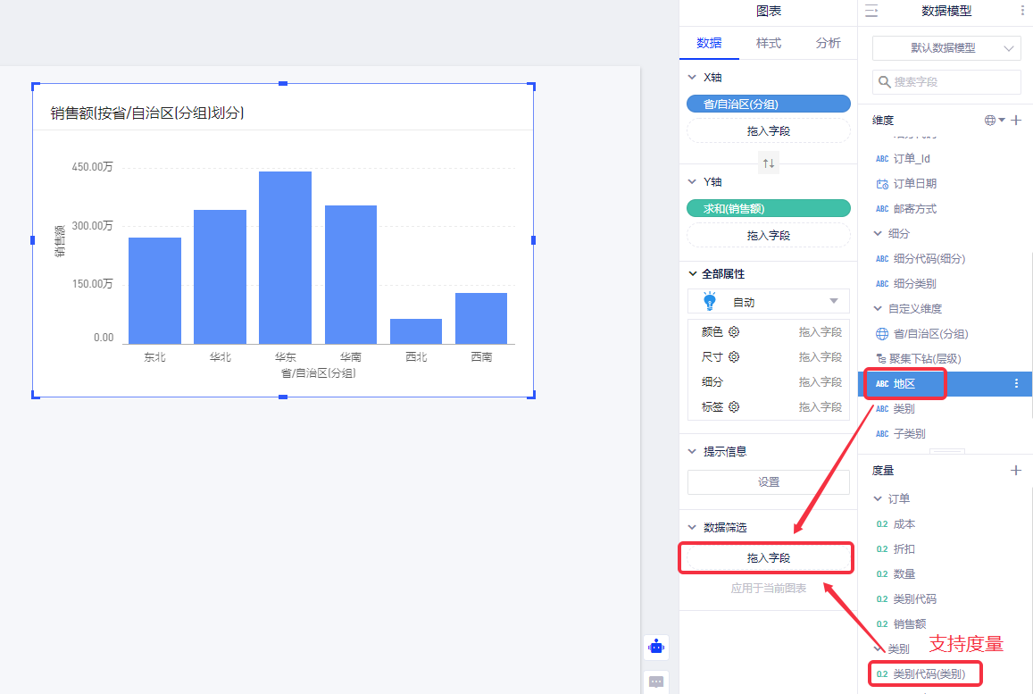 选中需要做筛选的图表,右侧将出现图表属性面板,然后将维度或度量字段拖入该图表的筛选器即可进行报表级筛选。