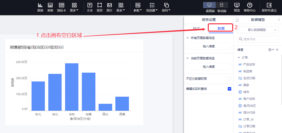 第二步:将维度字段拖入【当前页面数据筛选】的筛选器;比如将维度“地区”拖入筛选器,将触发列表筛选和文本筛选: