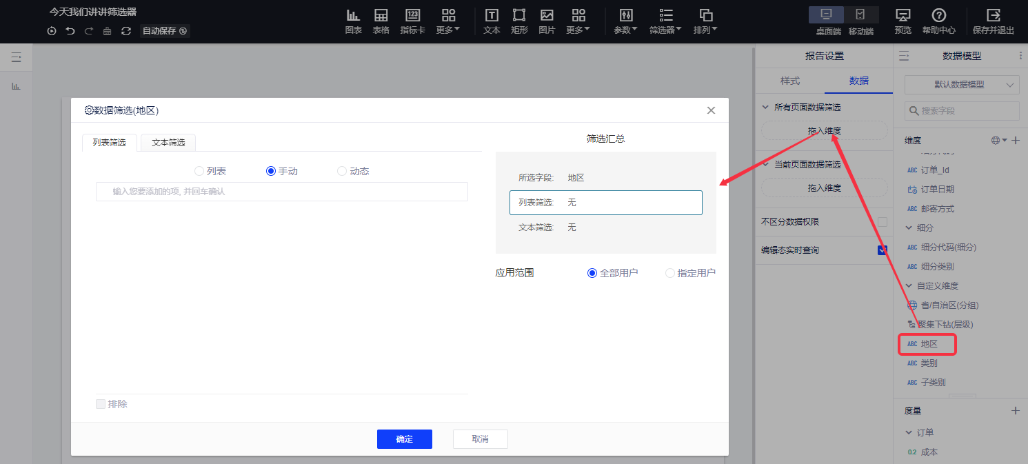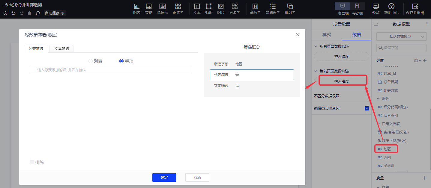 第二步:将维度字段拖入【所有页面数据筛选】的筛选器;比如将维度“地区”拖入筛选器,将触发列表筛选和文本筛选: