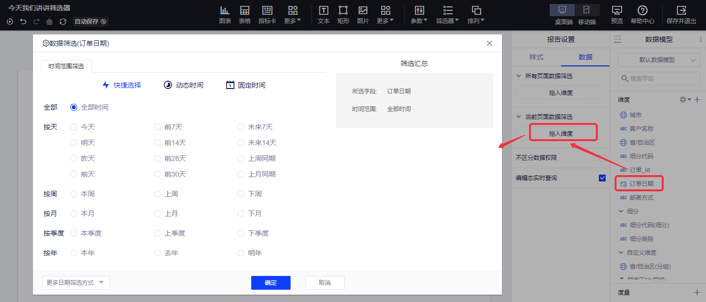 第三步:将时间维度字段拖入【当前页面数据筛选】的筛选器;比如将时间类型字段“订单日期”拖入筛选器,将触发时间筛选。