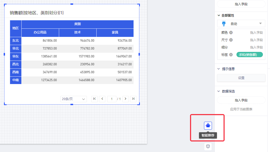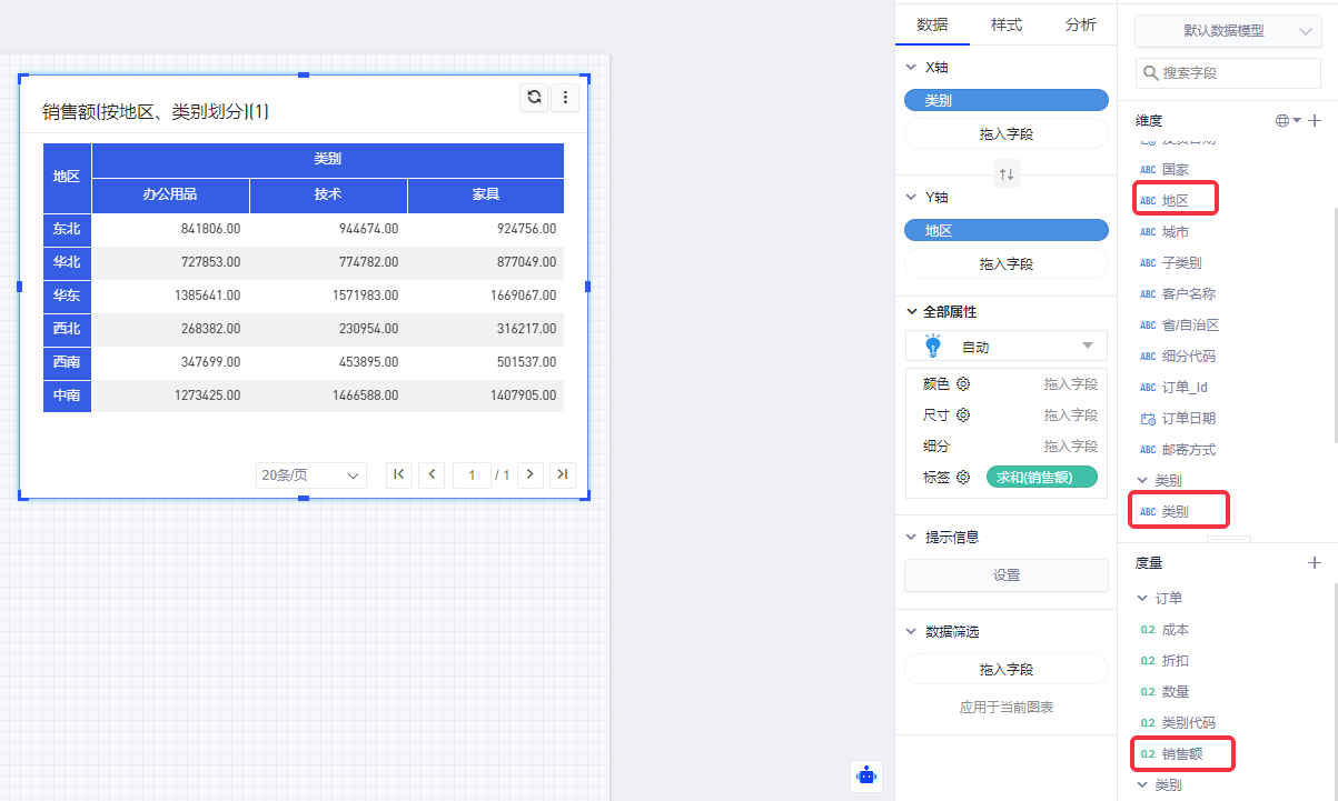 以默认数据模型为例,查看每个地区中各个产品类别的销售额情况,将涉及到3个字段:维度“地区”、“类别”,度量“销售额”。