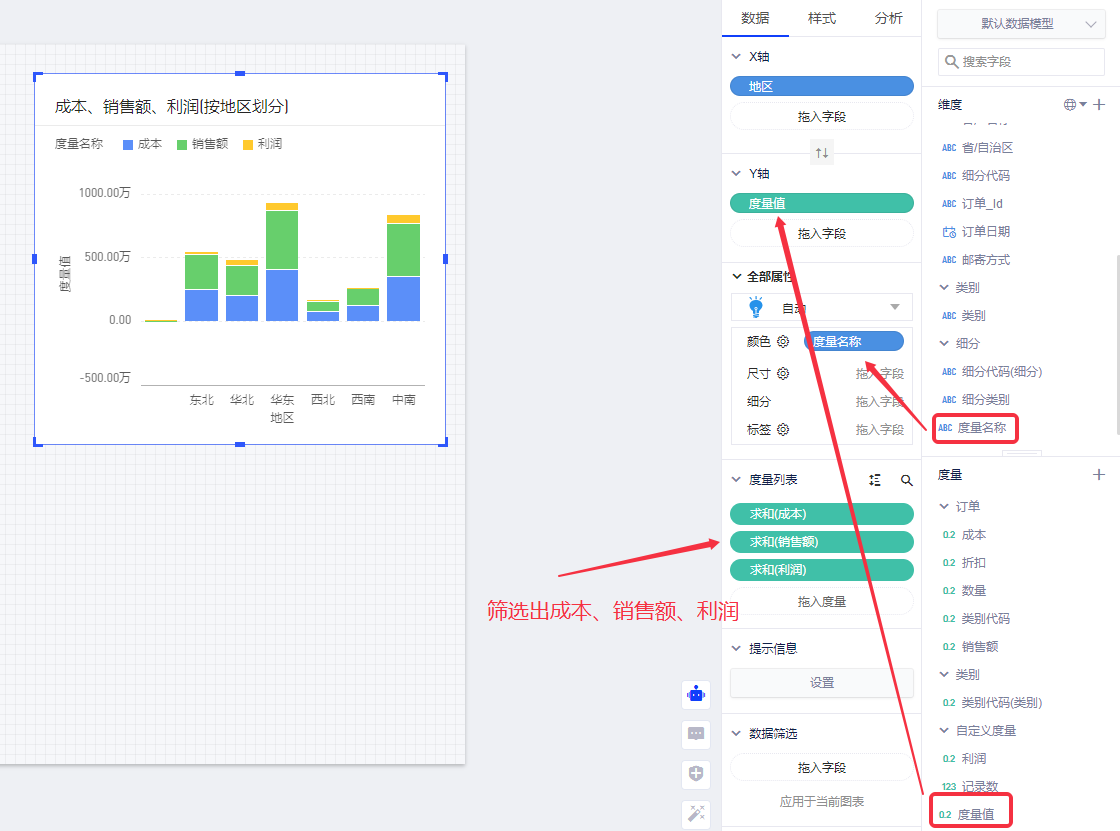 查看每个地区的销售额,利润,数量情况,将涉及到3个字段:维度“地区”、“度量名称”,度量“度量值”。