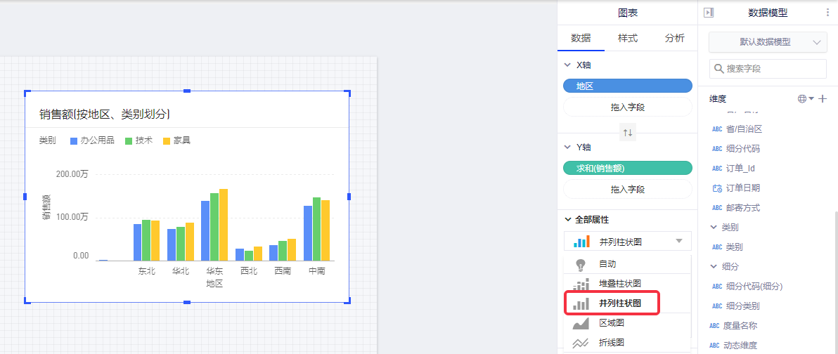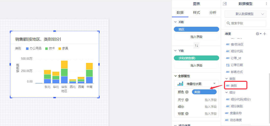 以默认数据模型为例,查看每个地区中各个类别的销售额情况,将涉及到3个字段:维度“地区”、“类别”,度量“销售额”。