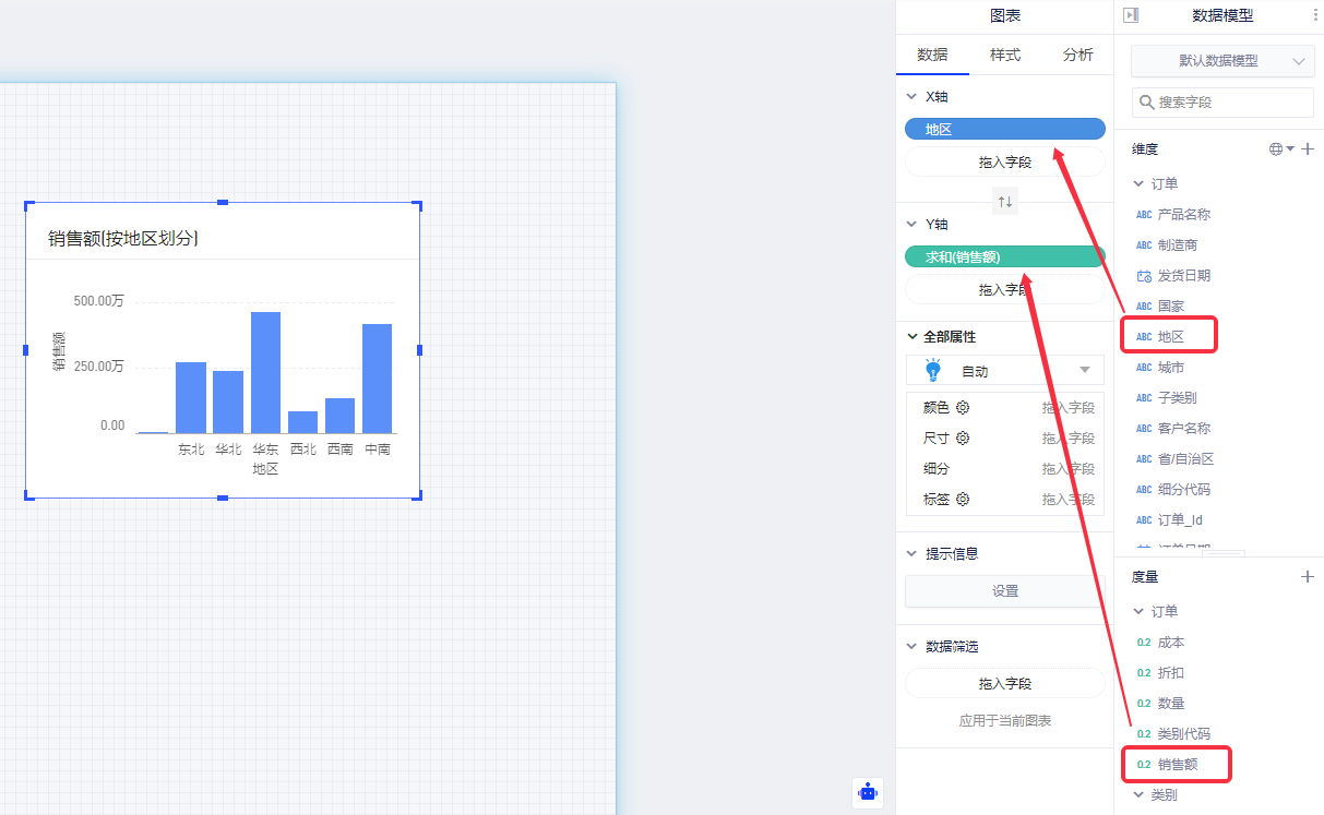 以默认数据模型为例,查看“每个地区的销售额”柱状图,将涉及到2个字段:维度“地区”,度量“销售额”。
