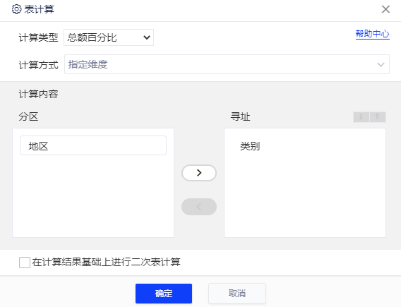(4)在表计算弹窗中,计算类型选择“总额百分比”,寻址“类别”;