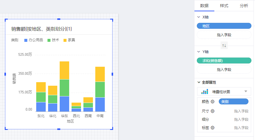 (2)在图表的数据面板的操作:维度“地区”放置在X轴,度量“销售额”放置在Y轴;属性面板上选择“堆叠柱状图”,将“类别”放到属性面板的颜色项内;