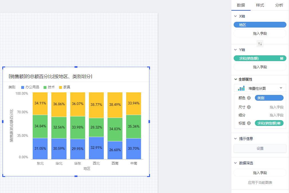 查看每个地区中各个类别的销售额占比情况,将涉及到3个字段:维度“地区”、“类别”,度量“销售额”。