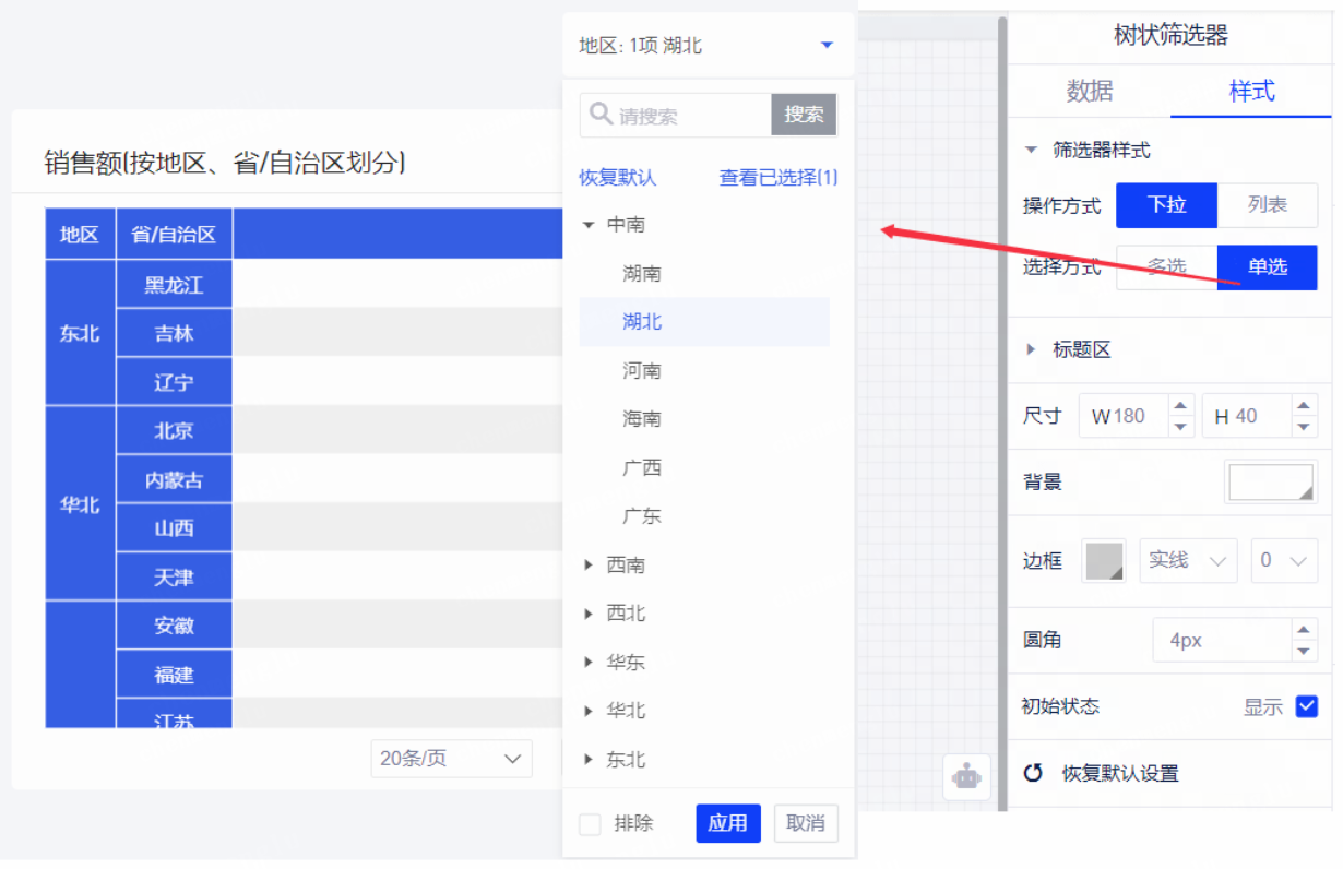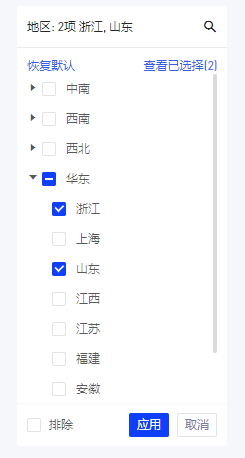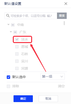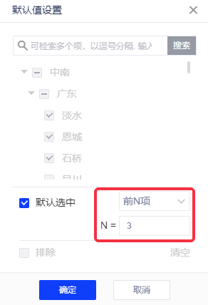 【前N项】:树状筛选器全部展开后最小子节点的前N项(例如:地区-省份-城市,地区下第一项是中南、地区第一项为广东、城市,默认选中前三项为最小子节点中南广东省淡水市、恩城、石桥,如下图演示)。