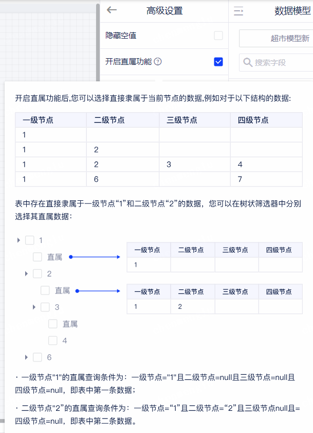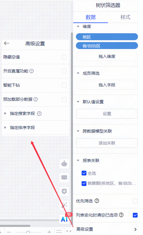 在树状筛选器的数据面板下方,点击“高级设置”按钮可进行隐藏空值、开启直属功能、智能下钻、预加载部分数据、指定搜索字段和指定排序字段设置。