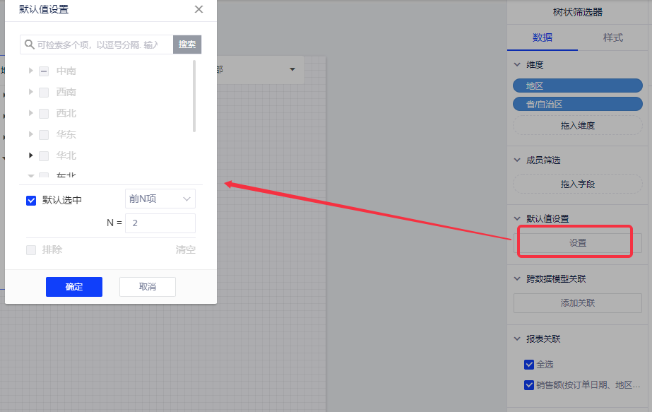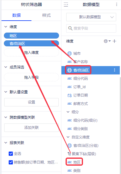 (2)在树状筛选器的数据面板的操作,将维度字段“地区”、“省份”拖入维度。默认会关联当前页面的同一数据模型的所有报表;