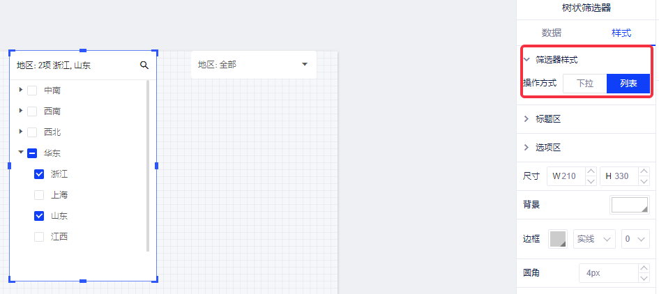 (1)选中“树状筛选器”,点击操作面板中的样式面板,可以选择操作方式和选择方式;