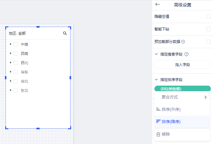- 指定排序字段:例如将字段销售额拖入(系统会对其进行聚合),然后设置降序排序,则意味着销售额高的地区-省份-城市排在前。