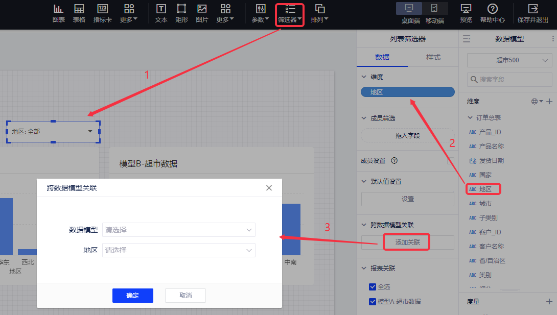 (1)先使用模型A的地区字段来做列表筛选器,然后进行跨数据模型关联设置;