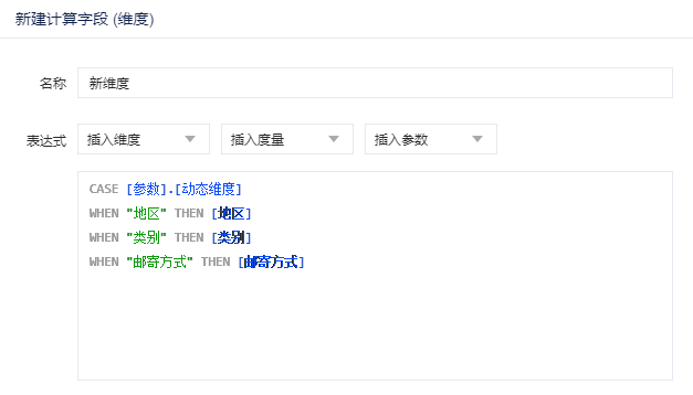 (2)使用参数:在计算维度中插入参数,如下图一个简单的case语句,对参数进行了判断;