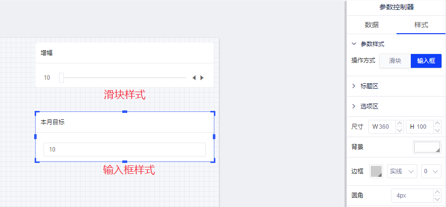 (3)完成参数选择后,您可在样式选择参数控件的样式,样式分为滑块和输入框(需参数可选范围为“区间”),可以修改标题、选项和背景边框等;
